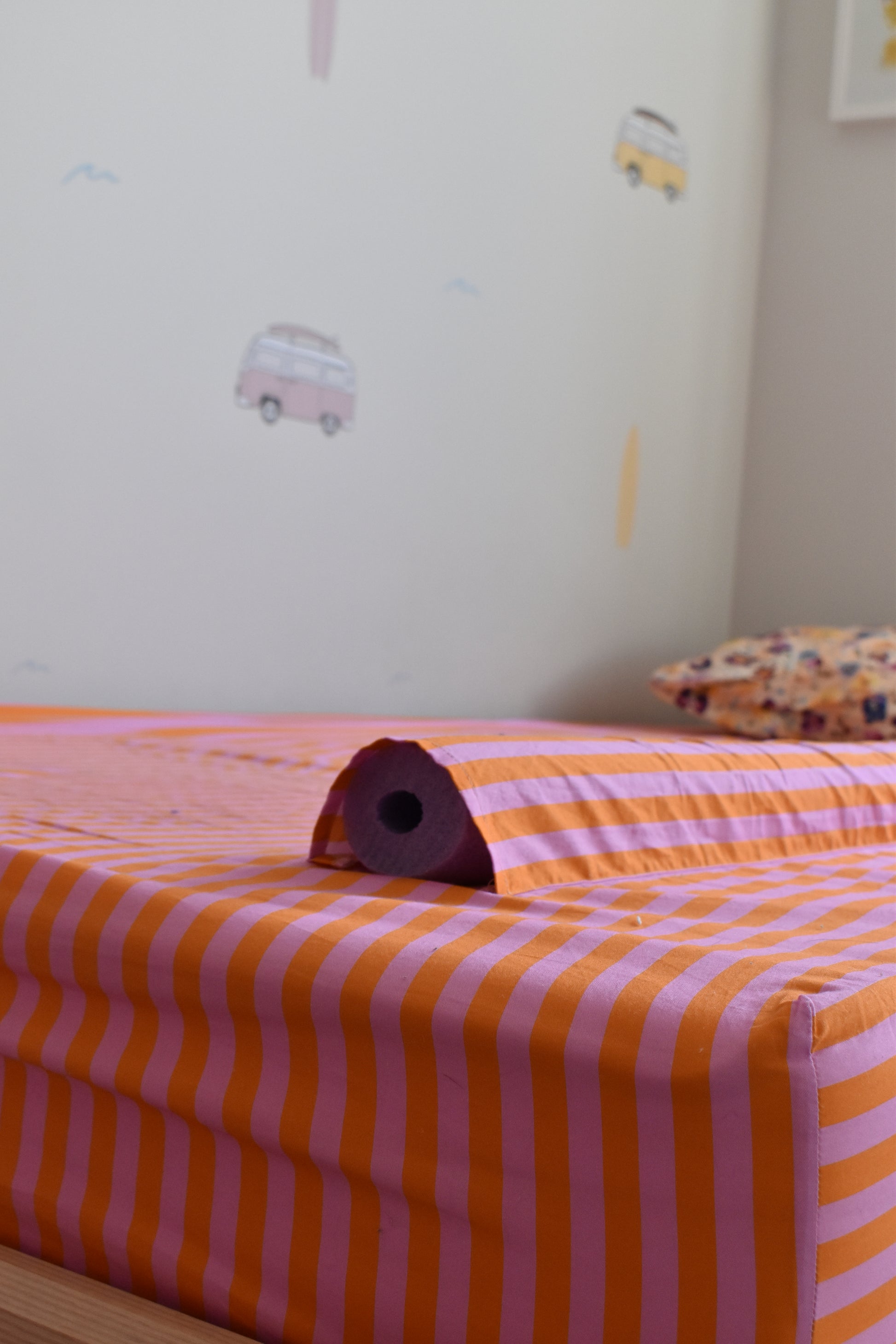 Tired of midnight tumbles? Noodle Nest is the playful, practical solution for toddlers transitioning from a cot to a big-kid bed. Our 100% cotton fitted sheet features a discreet loop along the edge where you can insert a standard pool noodle to create a soft, gentle bumper. It helps keep your little one snug and minimises the risk of rolling out—without bulky rails or complicated setups.